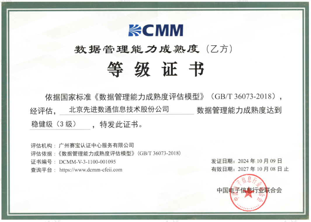 近期,中国电子信息行业联合会公布了最新一批顺利获得数据管理能力成熟度(DCMM)贯标等级认证的企业名单。evo真人视讯成功取得数据管理能力成熟度稳健级(三级)认证。这一认证的取得,标志着evo真人视讯在数据治理体系构建和数据管理与应用能力方面,已经达到了国家权威组织认可的标准。这不仅是对evo真人视讯在数据管理领域专业能力的肯定,也是对其在有助于数字化转型服务和数据驱动决策方面所做努力的认可。